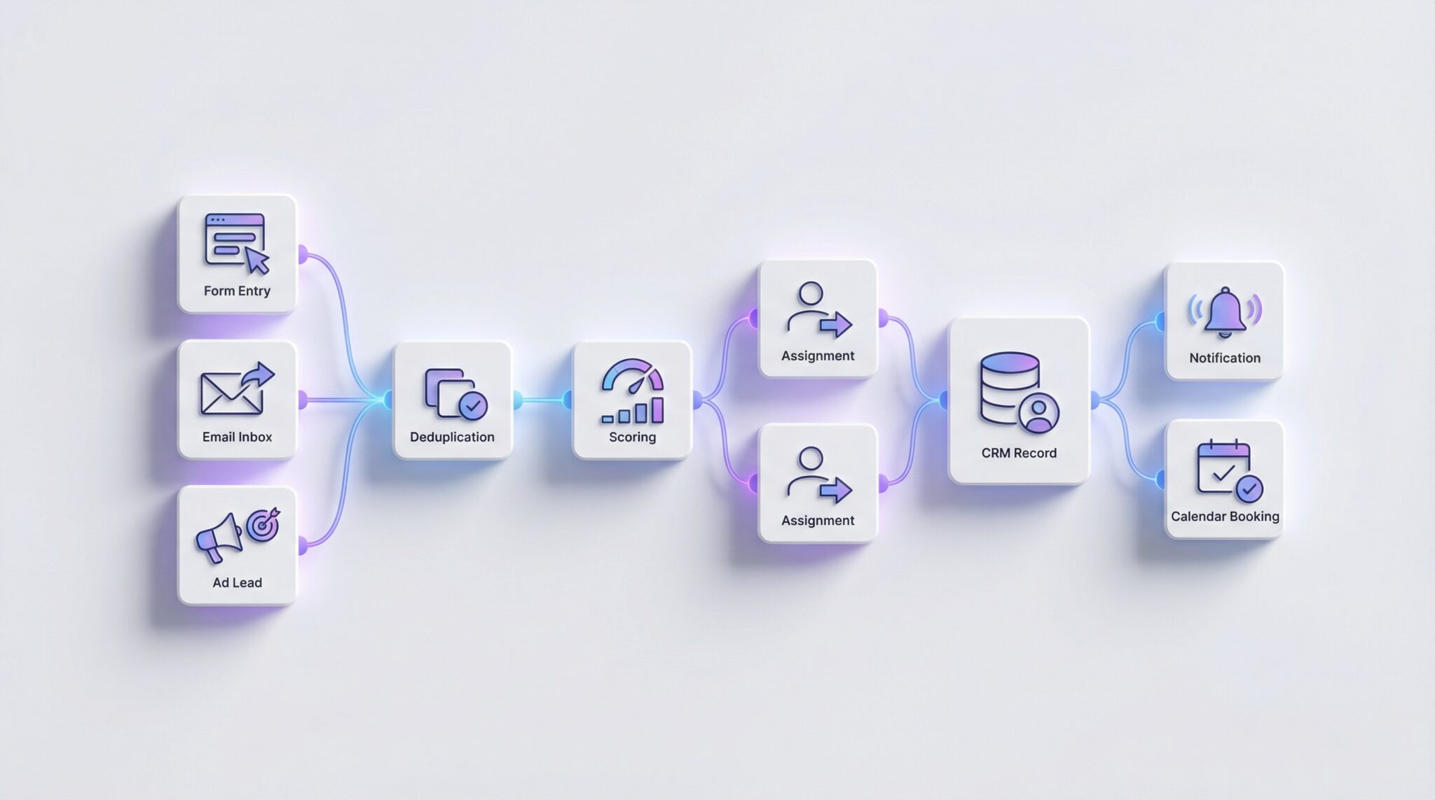 Anbindungen, Normalisierung, Routing, CRM Sync, Benachrichtigungen, Follow up, Logging.